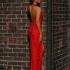 A beautiful full length gown by Australian Designer Jadore, Style JX3019. Featuring a halter neckline, this form fitting gown is covered in a gorgeous embellished lace detailing. The Georgia Gown also features an open back, and is finished with a high side split.