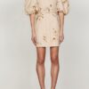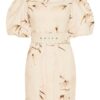 Fitted mini dress in a pure linen in the exclusive Sundance print. This dress features off the shoulder neckline, decorative front tab, puff sleeve with elasticated cuff, invisible back zip and detachable belt.