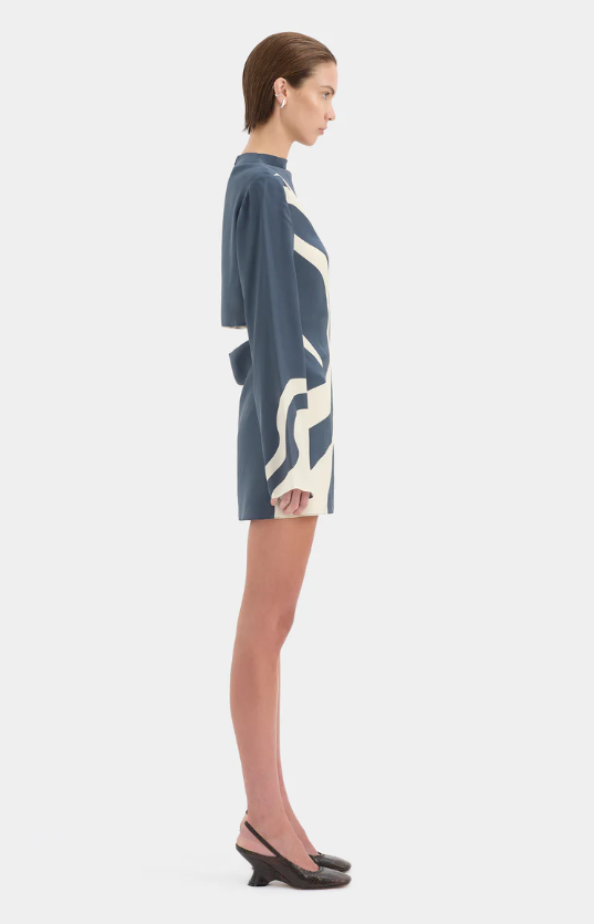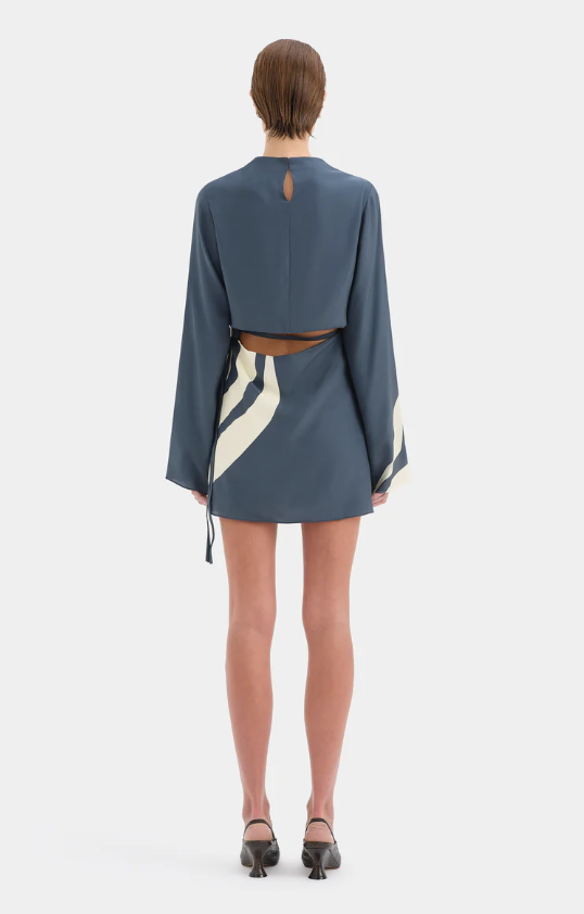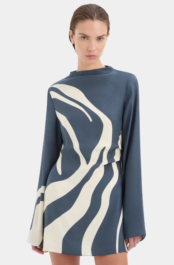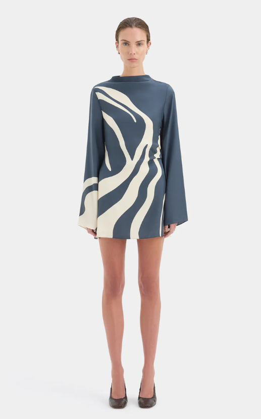 The Lilou Long Sleeve Mini Dress is a bias cut silhouette, crafted from our signature silk in an exclusive Liora Charcoal Blue SIR. print. Featuring a cowl neckline, relaxed full length sleeves and open back with tie detailing for an elegant finish.